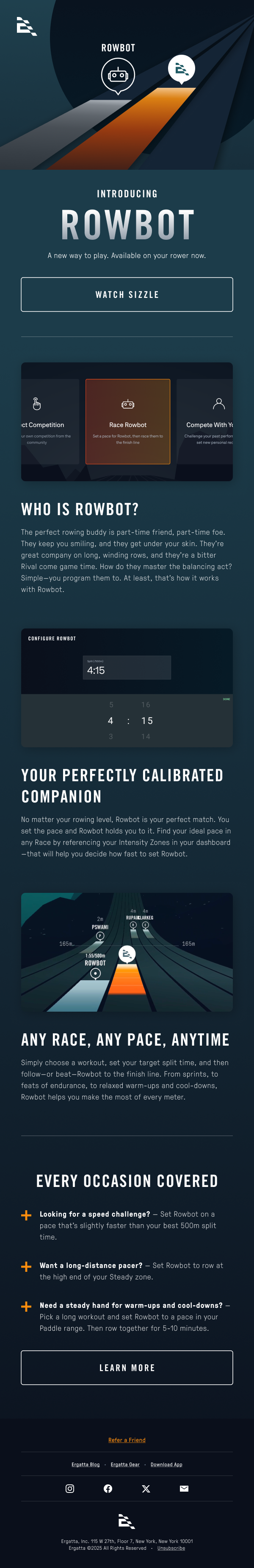In 2025, I was tasked with designing a feature for Ergatta’s Races Experience that would help motivate members to push themselves in a more personalized way. Thus, the idea for Rowbot emerged - a pacer bot that you can customize to race alongside you. For this project, I helped conceptualize, design, brand and market the feature.